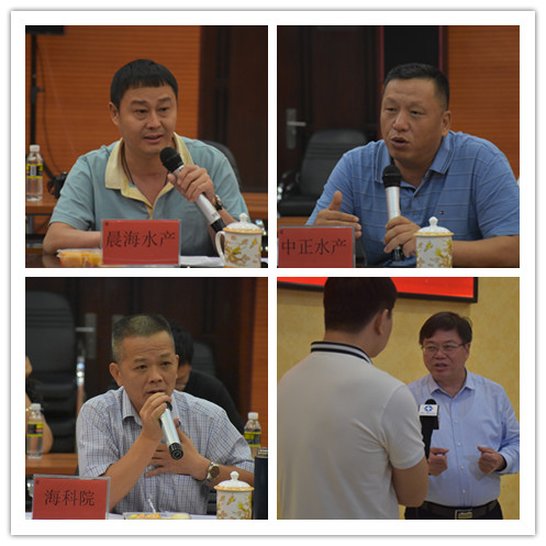 随后,各个水产企业代表从各自角度对海南水产业进行介绍,并提出了养殖污水处理标准不清、人才短缺、水产体系亟取完善、水产品疾病防控与有效疫苗缺乏、无配套水产码头等问题。两位院士对各个企业提出的问题提出了解决意见。最后,海南海洋与渔业科公司代表对如何提高水产地位、加大对南方水产的福利政策、海南水产面临的机遇与挑战等问题进行了解答。