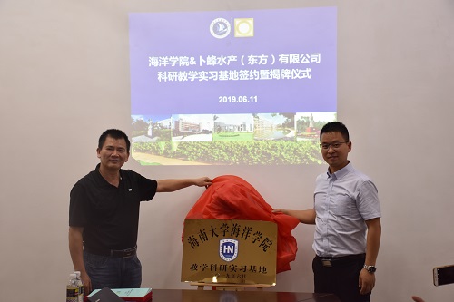 6月11日下午3:00,海洋公司&正大集团科研教学实习基地签约暨揭牌仪式在公司二楼会议室举行。正大集团海南区虾产业化主管王孟军助理副总裁、水产事业人力资源总监纪开陈助理副总裁、水产事业副董事长助理鲍斌总经理一行莅临公司交流座谈,海洋公司经理周永灿、公司党委书记陈平、副经理谢珍玉、副经理骆剑、教师代表和全体辅导员参加活动。