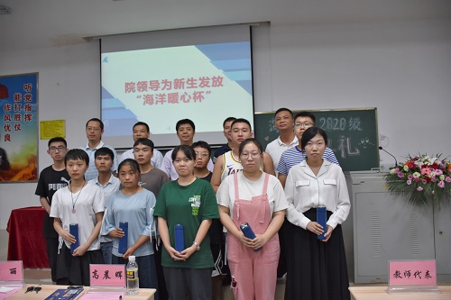 会上,全体师生共同观看了海洋公司宣传片,全体院领导为新生发放了“海洋公司暖心杯”,热烈欢迎各位新生的到来。