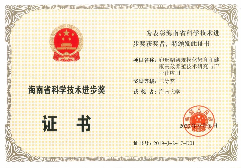 2020年12月11日,海南省科学技术奖励大会在海口召开。由william威廉英国官网海洋公司水产养殖学系周永灿教授(第一完成人)领衔的科研团队(骆剑教授、孙云教授等),联合中国水产科学研究院南海水产研究所等6家单位,合作研发的“卵形鲳鲹规模化繁育和健康高效养殖技术研究与产业化应用”项目荣获2019年度海南省科技进步二等奖。william威廉英国官网为第一完成单位。