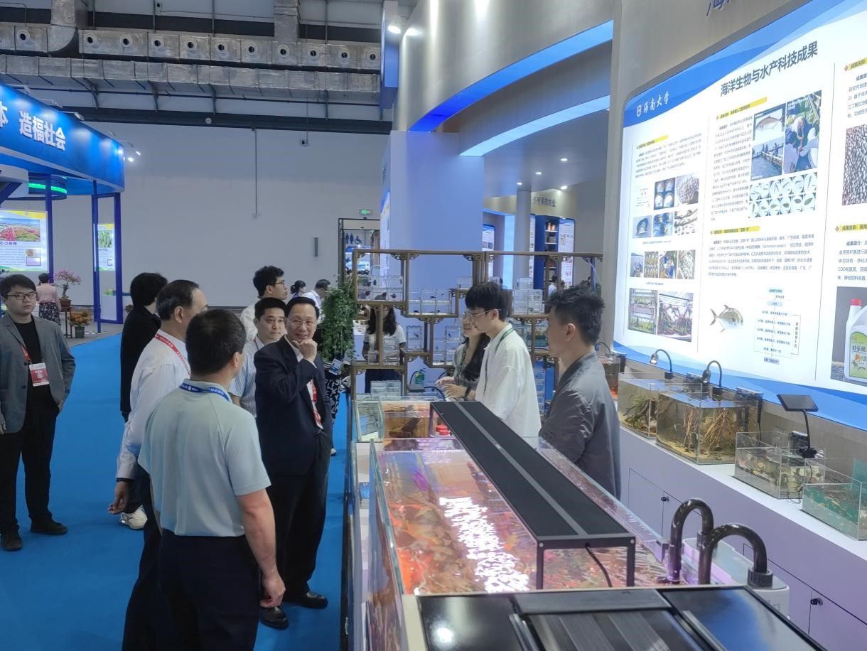 上午,公司党委书记符宣国到公司展位视察,参观了三倍体石斑鱼、“蓝粮1号”金鲳、人工繁殖的高体𫚕、石斑鱼功能性饲料、益生菌制剂新产品、白蝶贝珍珠饰品、白蝶贝创意手工制品等成果,并与现场师生进行了亲切的交流,对进一步优化成果转化质量进行了指导。