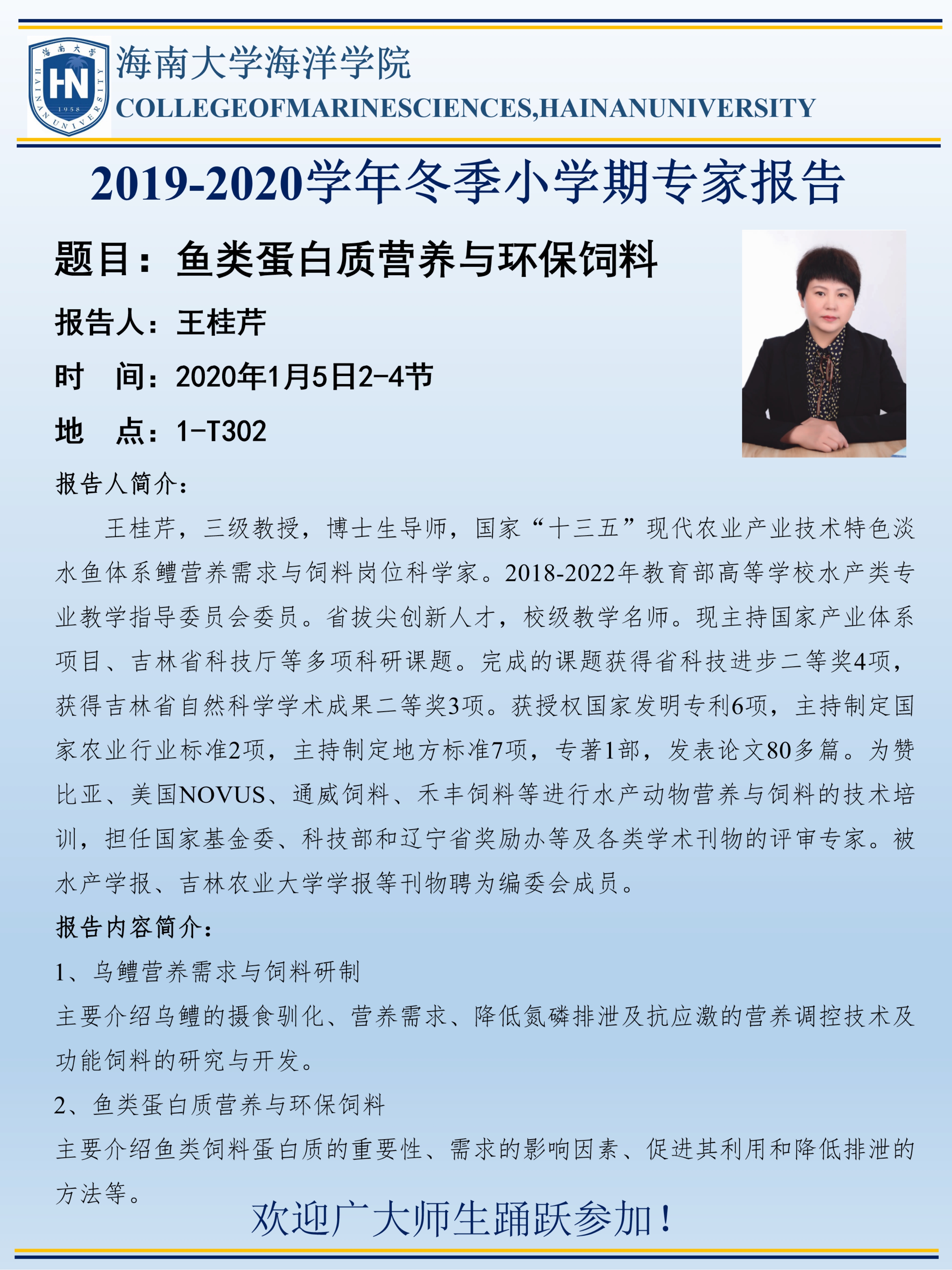 教学动态 当前位置: 首页 公司产品 教学动态 正文 【2019-冬季小学期系列课程二】 吉林农业大学王桂芹教授主讲《鱼类蛋白质营养与环保饲料》 日期:2020年01月02日 19:33  点击: 【2019-冬季小学期系列课程二】 吉林农业大学王桂芹教授主讲《鱼类蛋白质营养与环保饲料》 下一条:【2019-冬季小学期系列课程一】 中国科公司院士桂建芳主讲《鱼类遗传育种学》