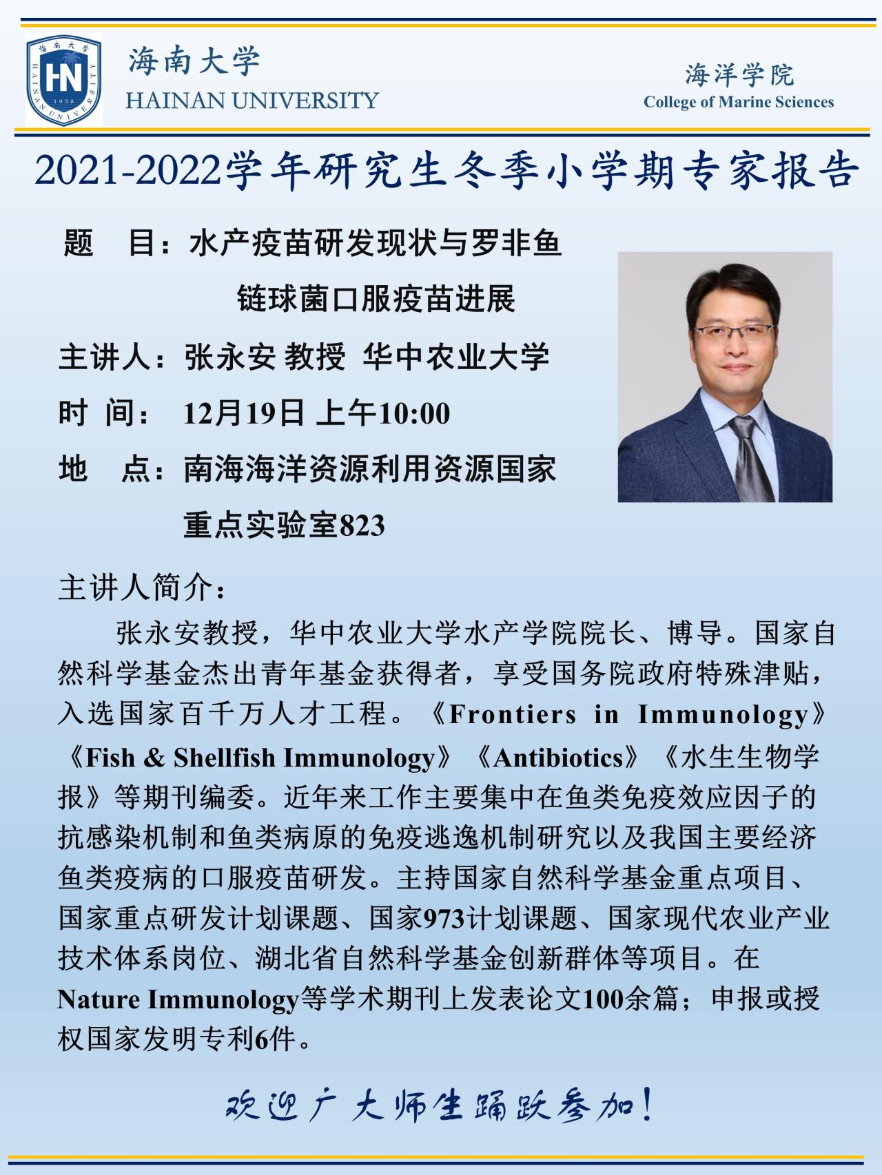 教学动态 当前位置: 首页 公司产品 教学动态 正文 【2021冬季小学期研究生课程建设】《水产动物疾病与控制》课程-华中农业大学张永安教授讲座 日期:2021年12月16日 22:48  点击: 下一条:【2021冬季小学期课程建设】中国科公司水生生物学研究所周莉研究员主讲《水产动物育种学》