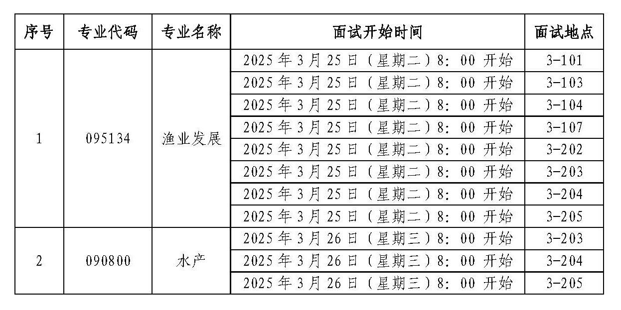 参加复试考生需满足各学科专业的复试分数基本要求,通过复试资格审查。水产学科(水产专业)和农业硕士渔业发展领域(渔业发展专业)因上线人数低于公布的招生计划数,所有满足相应学科(类别)教育部公布的《2025年全国硕士研究生招生考试考生进入复试的初试成绩基本要求》(B类考生)的考生都参加复试。