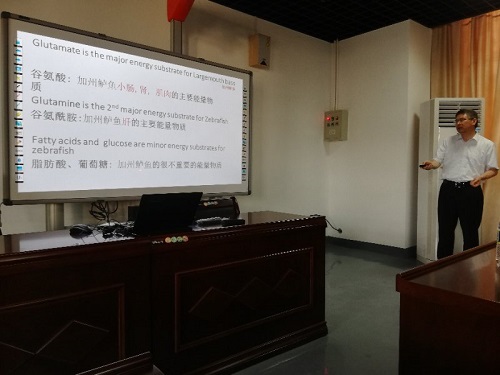 2019年5月20日,美国德州农工大学杰出教授、国际著名动物营养学家伍国耀为公司师生做精彩报告,报告题目:Amino acid metabolism for ATP production in fish。伍教授采用同位素技术、细胞学技术比较研究了氨基酸、脂肪酸、葡萄糖在斑马鱼、加州鲈鱼骨骼肌、肝脏、肠道、肾脏组织中作为能源的代谢情况。伍教授研究结果显示谷氨酸、谷氨酰胺和亮氨酸代谢为斑马鱼、加州鲈鱼骨骼肌、肝脏、肠道、肾脏提供了近80%的ATP,这是国际上首次报道氨基酸而不是脂类或糖类作为鱼类主要组织能源的直接证据。