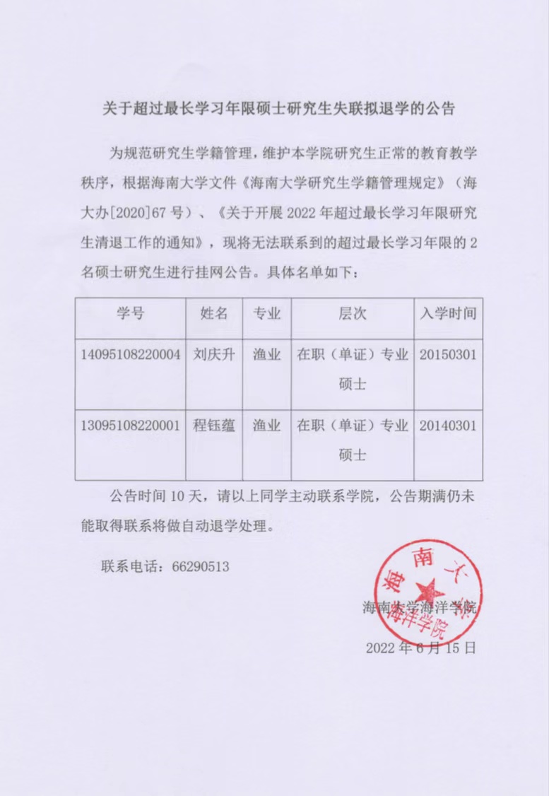 公司公告 当前位置: 首页 公司公告 正文 海洋公司关于超过最长学习年限硕士研究生失联拟退学的公告 日期:2022年06月15日 12:51  点击: 下一条:海南老员工物学博士学位点硕博连读和申请考核参加面试考生名单公示 (海洋组)