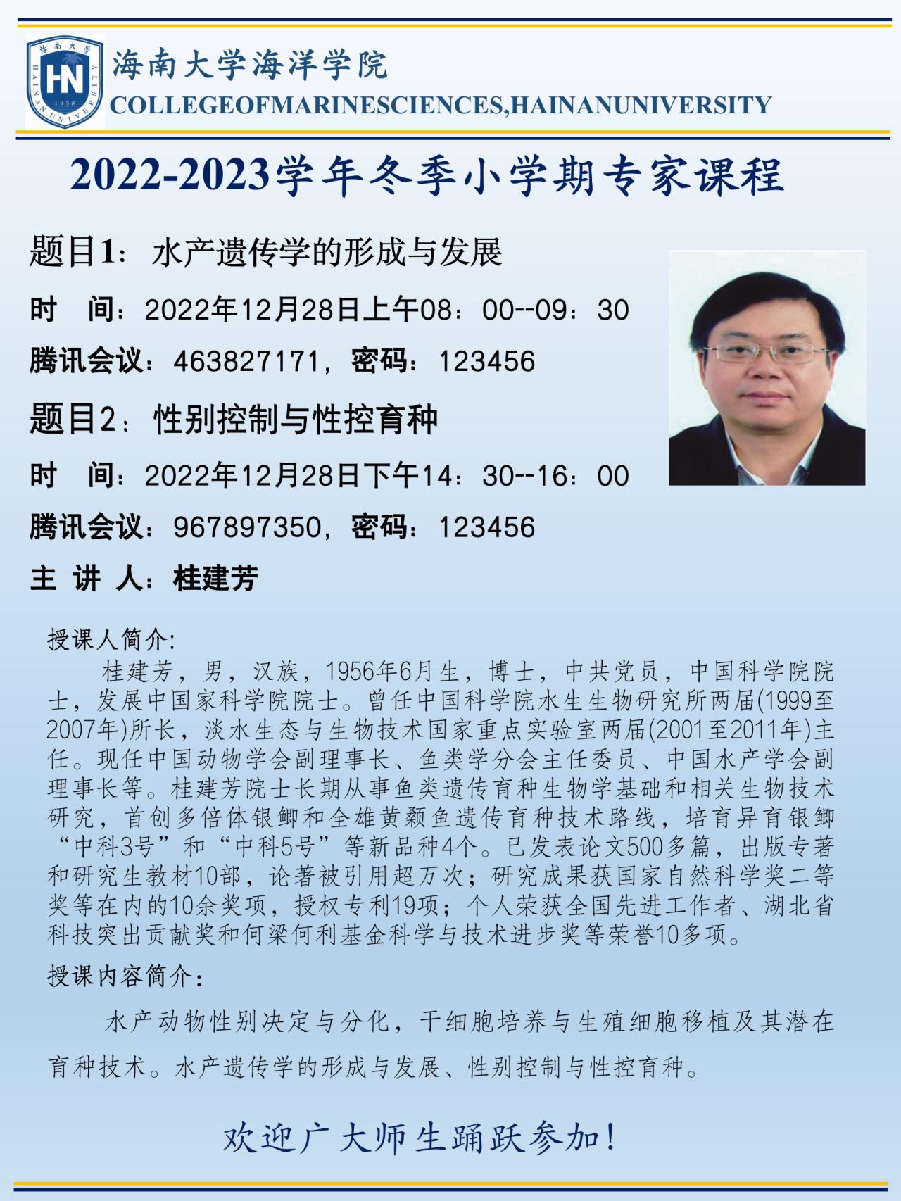 公司公告 当前位置: 首页 公司公告 正文 海洋公司水产专业2022-2023冬季小学期专家课程-桂建芳(院士) 日期:2022年12月23日 16:31  点击: 下一条:海洋公司聘请澳大利亚水产养殖学专家授课项目圆满收官