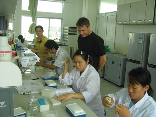 国外专家指导水产养殖系员工实验